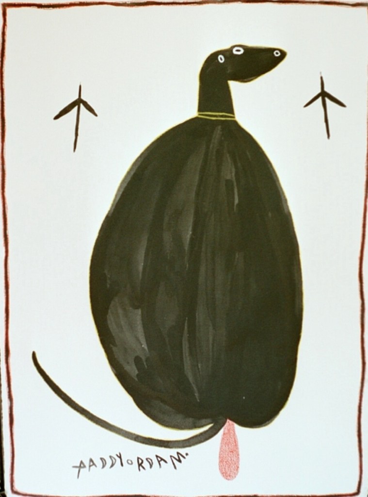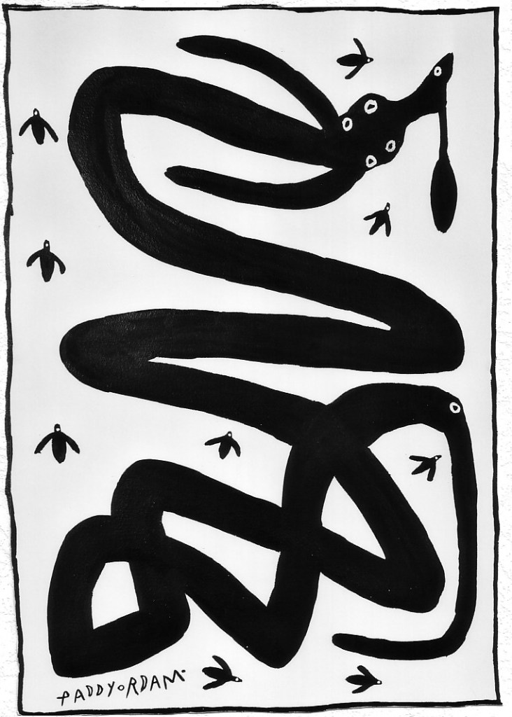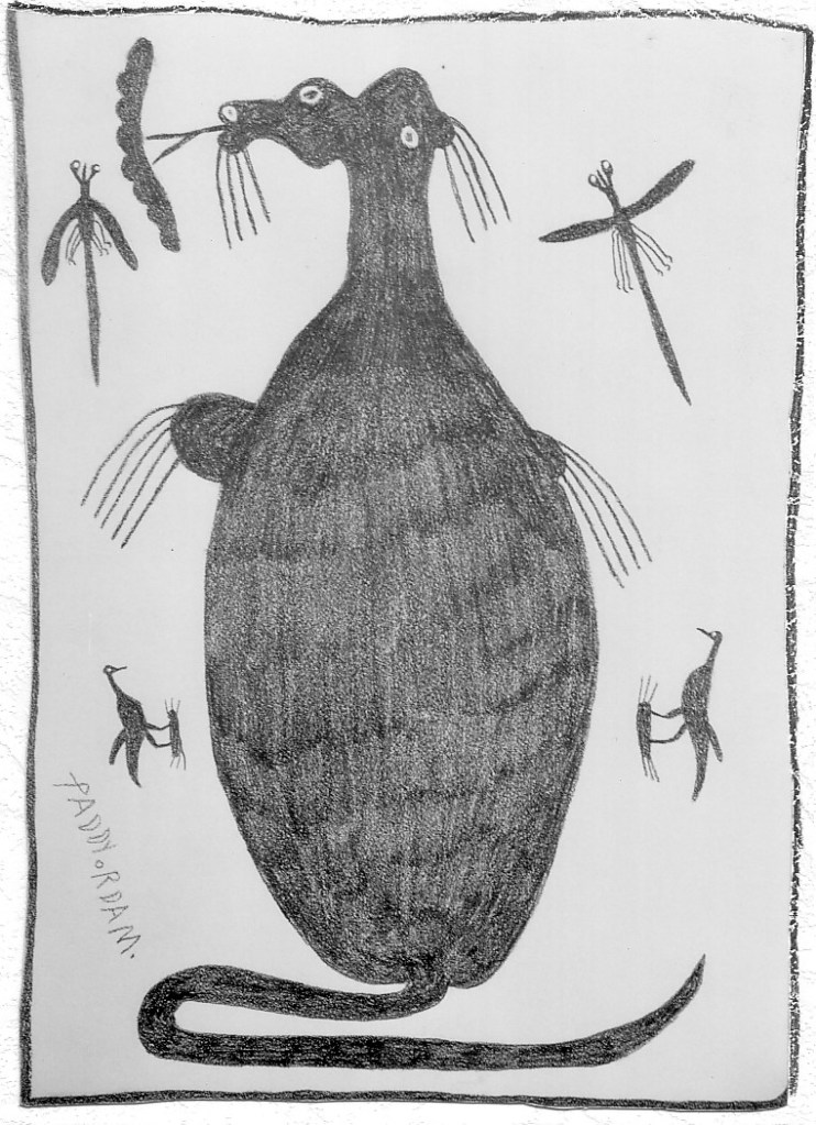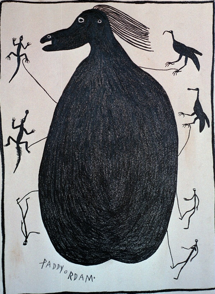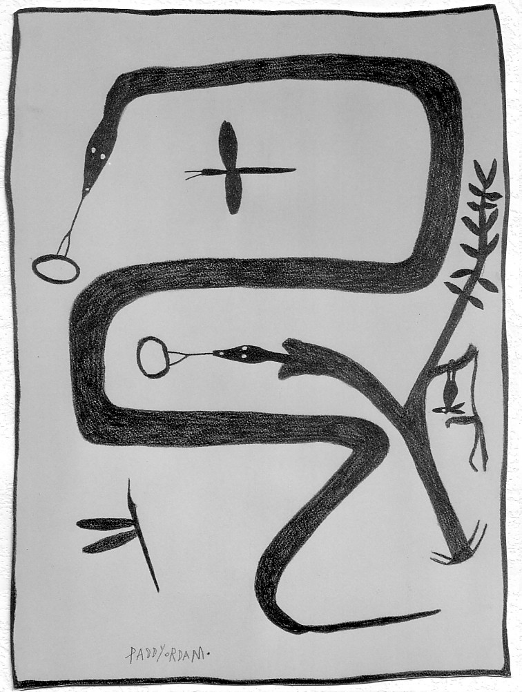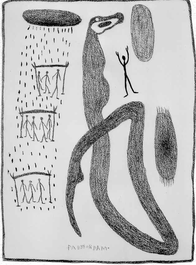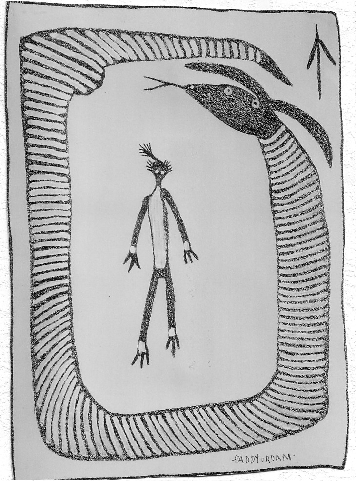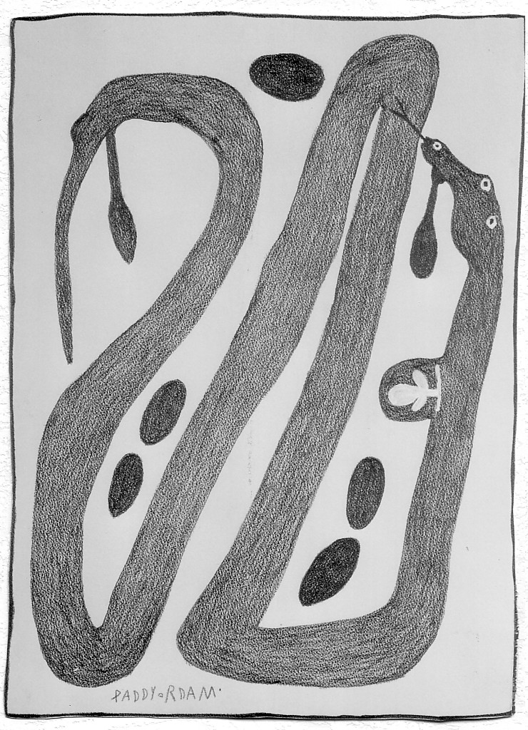 This dragon go along the top, he travels on the land. He lives in the spring water along the river, quiet place is where he live and that’s where the kangaroo go to drink the spring water. He is like a tadpole when the kangaroo take him on from the spring water. That is the Plains Kangaroo, red one, he takes him to the dry desert country. Kangaroo will drop him. He will poke his tongue out and this will make the clouds and rain come for himself. He not walk long way, just short one. He starts off small but when he finished he is from one hill to another. It’s in the Bible. He stands up like colour when the rain come.