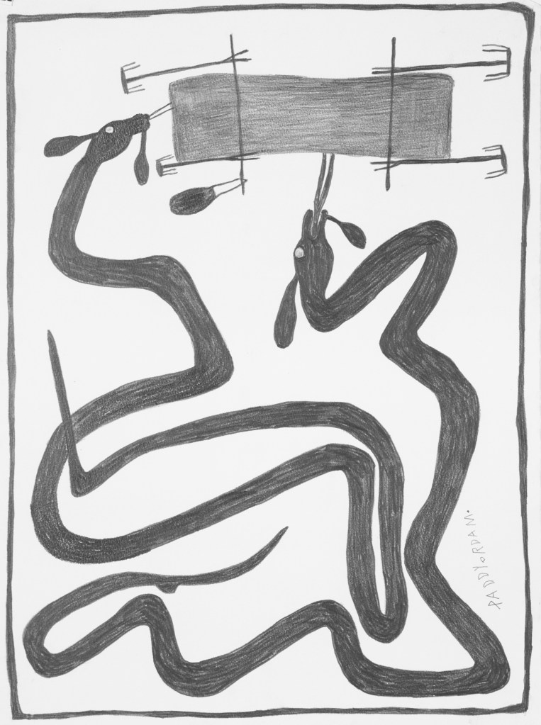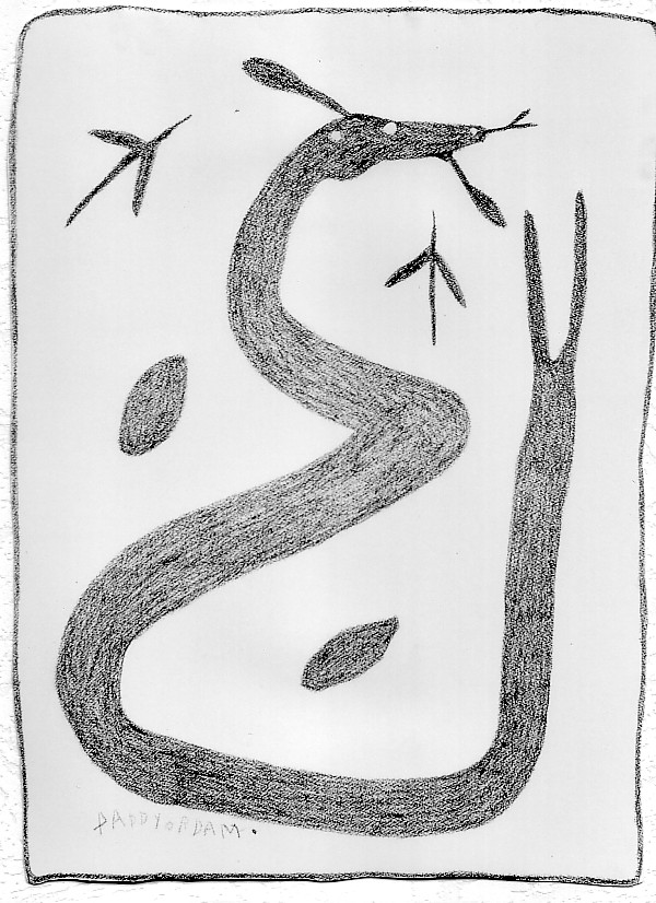 He was a human being but he was walking like a whip snake. He was a snake animal from dreamtime, from when the water was boiling. For a long time he dreamed that tree. Bolungbolung Tree he called himself, but he really Whip Snake tree.