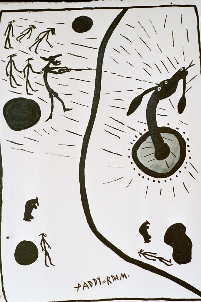 For a long time there wasn’t any water, then King Brown from Middle Arnhemland, from Bamdibu Spring. That’s our place Kulajuk. That’s where he walked out from the spring, two miles out he made a black rock finish. He turned. He got four eye. He still there. Gammoemoeduru (place name).