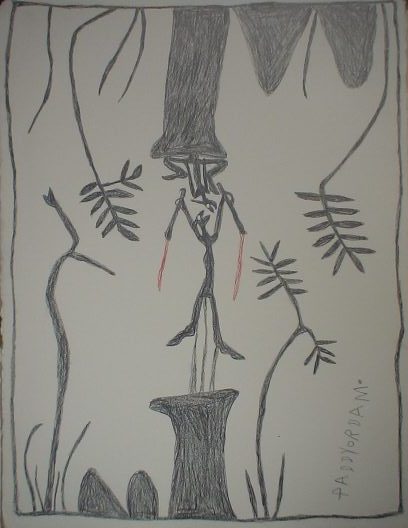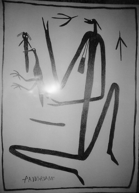 Those two, Balangjarrngalan man and wife. They standing up on hollow log tree so they can look long way for each other, in their block area.